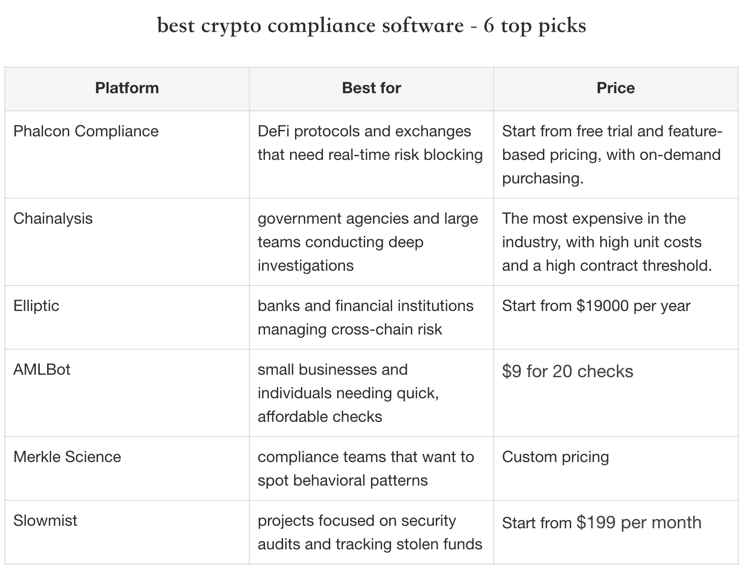 Die Wahl des richtigen Partners ist der beste Weg, um das Gesetz einzuhalten und Ihr Krypto-Unternehmen zu schützen. Im Folgenden betrachten wir die besten Krypto-Compliance-Softwareoptionen, die Ihnen die Macht geben, legal zu bleiben und Ihren Betrieb sicher zu halten.
